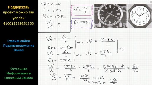 Физика Длина минутной стрелки башенных часов в 10 раз больше длины минутной стрелки настенных часов (см. рис.). Сравните скорости движения
