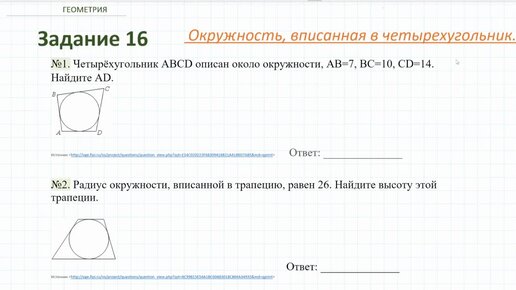 Окружность, вписанная в четырехугольник. Разбор задания №16 ОГЭ