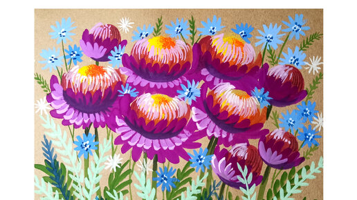 🌺🌸🌺Декоративное рисование цветов гуашью на крафтовой бумаге. 🌺🌸🌺