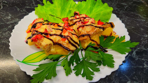 Куриное филе с картошкой, болгарским перцем и помидорами под сыром в духовке (видео рецепт)