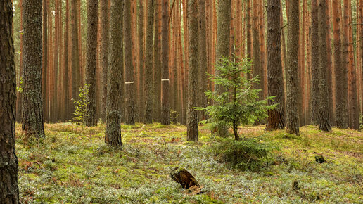Живописный хвойный лес в России у Волги в Тверской области, Кимрский район