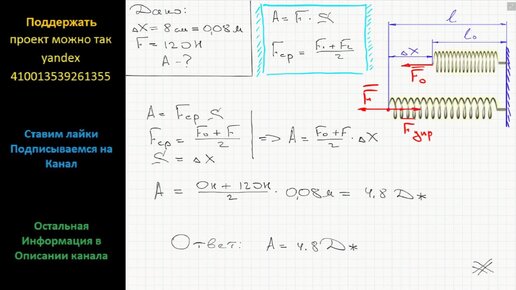 Физика Чтобы растянуть пружину на расстояние x = 8 см, надо приложить силу F = 120 Н. Какую работу совершили при растяжении пружины?