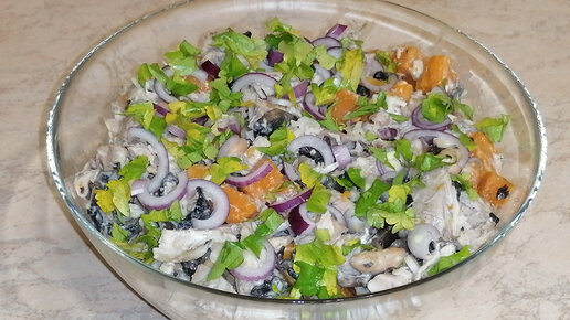 Салат мясной с тыквой, консервированной фасолью, грибами и луком