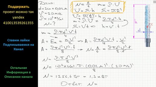 Физика Насос выбрасывает струю воды диаметром 2 см со скорость 20 м/с. Какую мощность развивает насос?