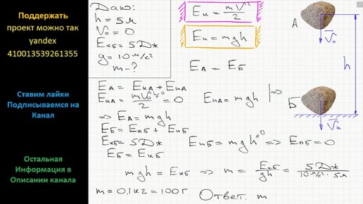 Физика Камень, свободно падающий с высоты 5 м, в нижней точке траектории обладал кинетической энергией 5 Дж. Определите массу камня