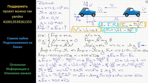 Физика Автомобиль массой 2 т при экстренном торможении остановился, пройдя 50 м Найдите работу силы трения и изменение кинетической энергии