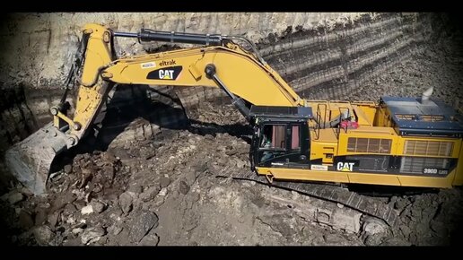 Экскаватор Caterpillar 390D, загружающий грузовики Mercedes и MAN