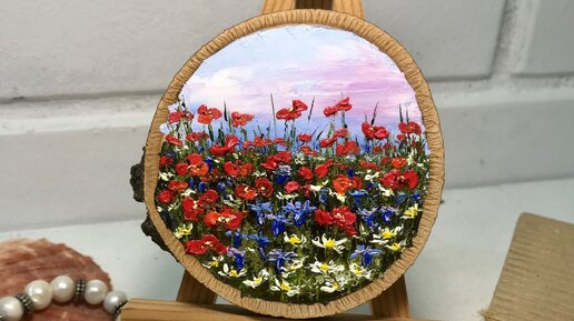 Миниатюра маслом Маки и Ромашки. Картина на срезе дерева Липа