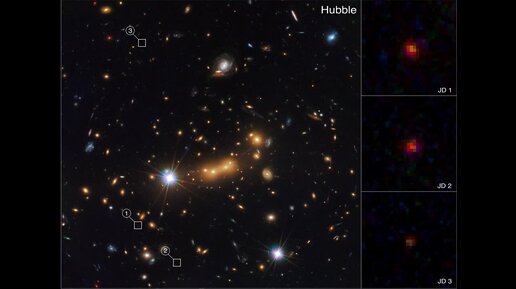 Вселенная. Сравнение изображений одной и той же области, полученных космическими телескопами «Хаббл» и «Джеймс Уэбб».