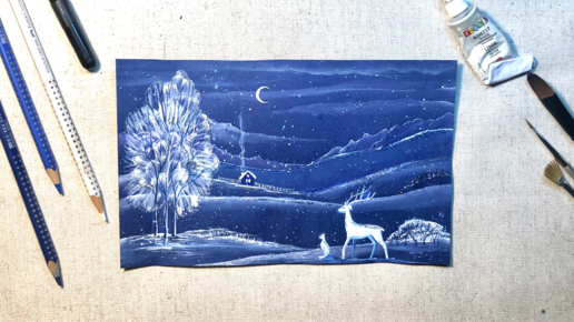 Рисуем ночной новогодний пейзаж. Олень, кошка, ночь. Гуашь, цветная бумага. Рисуем вместе.