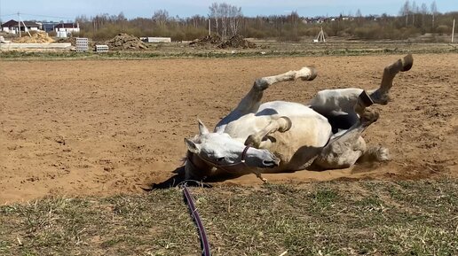 Лошадка валяется и принимает песчаные ванны😆