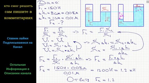 Физика Малый поршень гидравлической машины под действием силы 150 Н опустился на 8 см, а больший поднялся на 1 см. Какая сила действовала