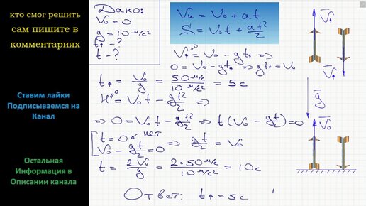 Физика Стрела выпущена вертикально вверх с начальной скоростью 50 м/с. Сколько времени стрела поднималась? Какова продолжительность полета?