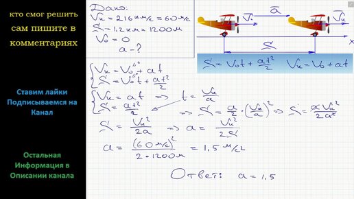 Физика Самолет отрывается от земли при скорости 216 км/ч. С каким ускорением он должен двигаться по взлетной полосе, длина которой 1,2 км?