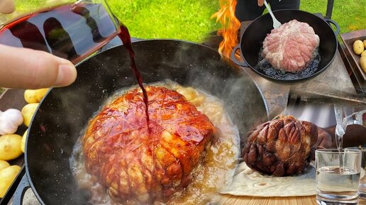 БУЖЕНИНА - МЯСНОЙ МЯЧ и ЖАРЕНАЯ КАРТОШКА в КАЗАНЕ на УГЛЯХ. ГОТОВИМ на ЮМОРЕ!