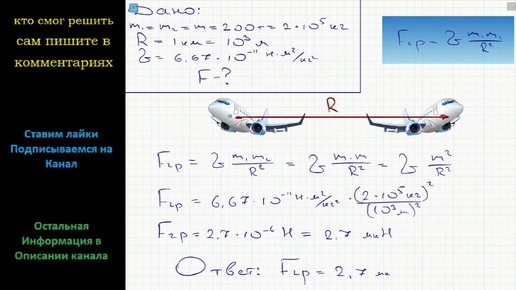 Физика Какова сила гравитационного взаимодействия между двумя тяжелыми транспортными самолетами массой по 200 т, пролетающими на расстоянии
