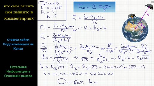 Физика На каком расстоянии от поверхности Земли сила притяжения космического корабля к Земле в 20 раз меньше, чем на ее поверхности?