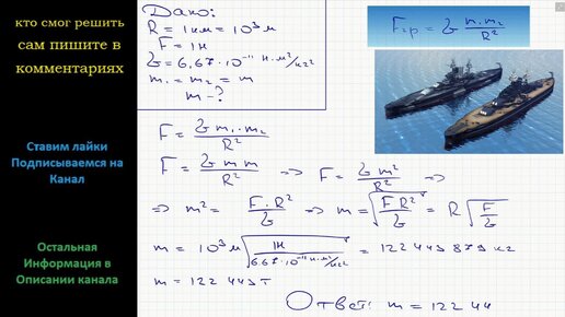 Физика Какой должна быть масса каждого из двух одинаковых кораблей, чтобы на расстоянии 1 км в море они притягивались с силой 1 Н?