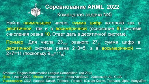 Найти наименьшее число, сумма цифр которого как в десятичной, так и в восьмеричной (основание 8) системе счисления равна 10.