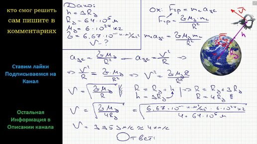 Физика Вычислить скорость движения спутника по круговой орбите, высота которой над поверхностью Земли равна трем радиусам Земли