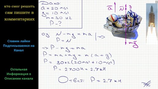 Физика Космический корабль стартует с Земли вертикально вверх с ускорением 20 м/с2 Каков вес космонавта во время старта если его масса 90 кг