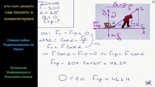 Физика Мальчик тянет по горизонтальной дороге санки, прикладывая к ним силу 50 Н под углом 300 к горизонту Какова сила трения между санками