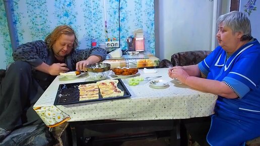 Идеальная деревенская семья готовит вкусно на кухне и с удовольствием кушает за обеденным столом ПОДВАЛ ИЛЬИЧА