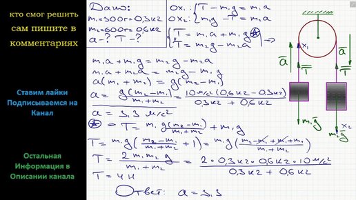 Физика К нити, перекинутой через неподвижный блок, подвешены грузы m1 = 300 г и m2 = 600 г. С каким ускорением движутся грузы? Какова сила