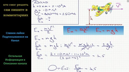 Физика Взлетевший самолет, поднимается на высоту 11 км, набирает скорость 900 км/ч. Сравните приобретенные самолетом кинетическую и