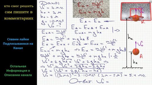 Физика С какой скоростью бросали баскетбольный мяч если он пролетел через кольцо со скоростью 3 м/с? Бросок произведен с высоты 2 м кольцо