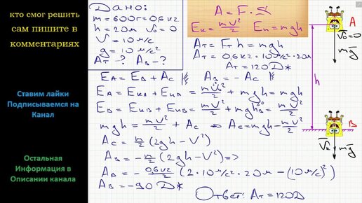 Физика Тело массой 600 г при падении с высоты 20 м приобрело скорость 10 м/с. Найдите работу силы тяжести и силы сопротивления воздуха