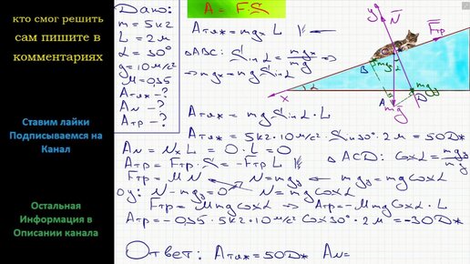 Физика Тело массой 5 кг соскользнуло с наклонной плоскости длиной 2 м. Найдите работы силы тяжести, силы реакции опоры и силы трения. Угол