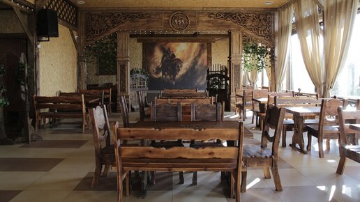 Декоративные балки и мебель из дерева в интерьере богатырского кафе в стиле кантри. История одного проекта «Артели «Русичи»