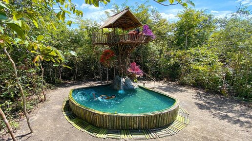 Построили своими руками бамбуковый бассейн вокруг дома на дереве используя примитивные инструменты.