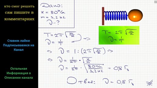 Физика Определите частоту колебания пружинного маятника, если жесткость пружины 80 Н/м, а масса груза 3,2 кг