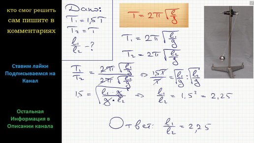 Физика Период колебаний первого математического маятника в 1,5 раза больше чем период колебаний второго Во сколько раз первый маятник