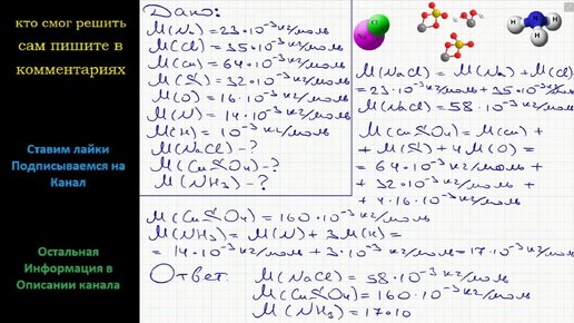 Физика Каковы молярные массы поваренной соли NaCl? Сульфата меди CuSO4? Аммиака NH3?