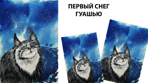 Нарисуем первый снег. Как нарисовать кота гуашью. Рисуем зиму. Как поэтапно нарисовать кота.