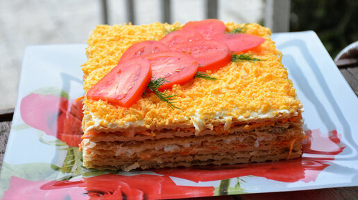 Закусочный торт "Мгновение". Самый удачный рецепт простого и сытного салата на праздничный стол