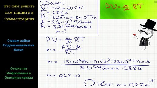 Физика Какова масса воздуха, занимающего объем 150 л при температуре 288 К и давлении 150 кПа?