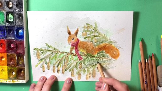 Новогодний рисунок акварелью. Белочка собирает шишки