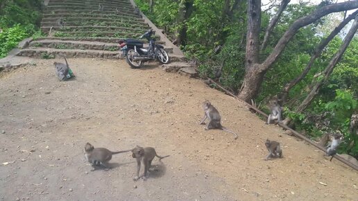 Остров Бали. Нашествие голодных обезьян. Обезьяны окружают. Вожак стаи обезьян выхватывает упаковку с чипсами и убегает