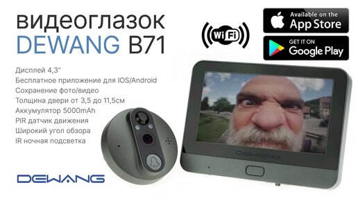 Dewang B71 - Wi-Fi видеоглазок с монитором и записью по датчику движения
