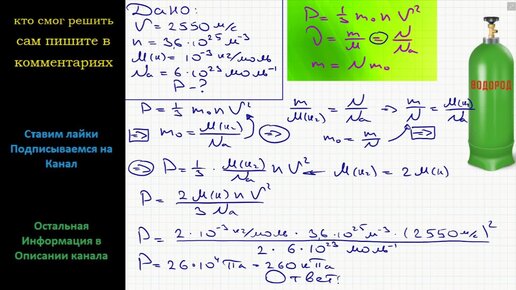Физика Определите давление водорода, если средняя квадратичная скорость его молекул 2550 м/с, а концентрация молекул 3,6٠1025 м-3