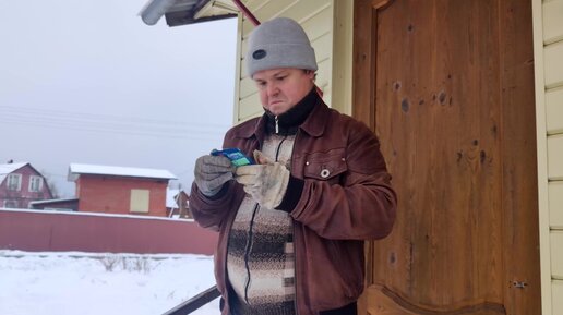Приехали на дачу зимой покормить бездомную кошку. Обзор дачного участка. Кошка уже ждет еду у порога дома за своим столиком из картона