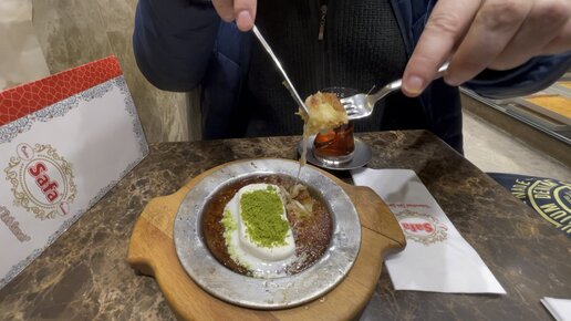 Пробую кюнефе. впервые взял с мороженым. Местечко за египетским базаром подсказал местный дружище. Вид кафе - скромный. Но пришлось ждать свободного места.