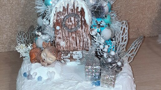 Ёлочка - домик из шишек и елочных шариков.