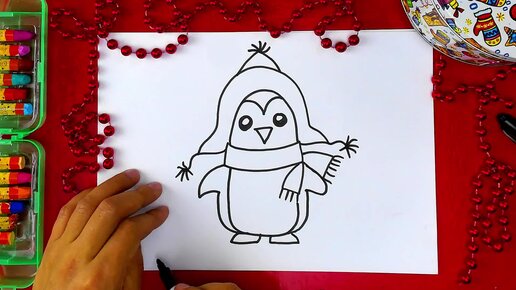 Пингвин - рисунки поэтапно и раскраска на Рождество