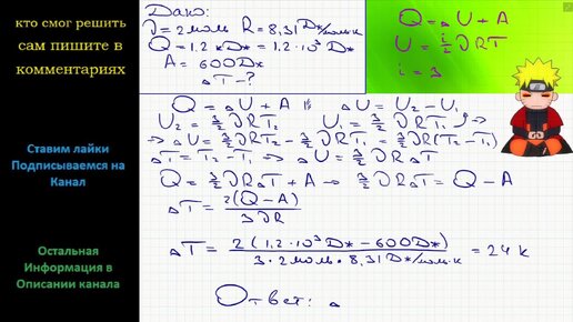 Физика Одноатомному газу (ν = 2 моль) передано количество теплоты 1,2 кДж. При этом газ совершил работу 600 Дж. На сколько изменилась