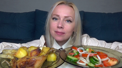 Картошка с курицей запеченные в духовке! Салат из свежих овощей. Еда на камеру.